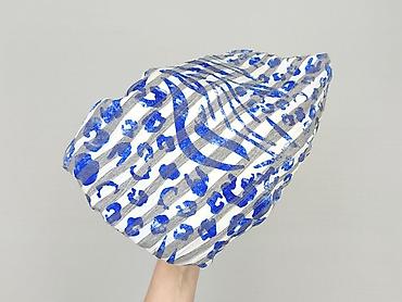 - Wzór: połączenie pasków i motywów animal print w odcieniach kobaltu, szarości i bieli, z lekkim połyskiem.