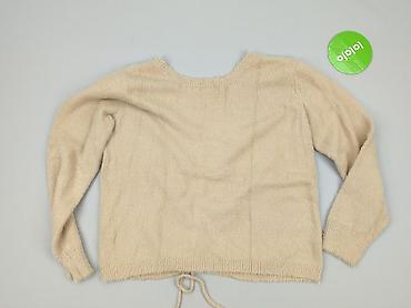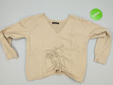 Beżowy sweter damski, rozmiar XL - Krój: krótki (cropped), z wiązaniem na sznureczki z przodu - Dekolt: V-neck - Rękawy: długie, lekko bufiaste, z szerokimi ściągaczami; delikatny wzór warkoczy na...