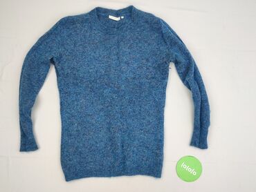 Sweter damski, dzianinowy, w kolorze denimowego niebieskiego. - Fason: luźny, oversize z obniżoną linią ramion - Dekolt: okrągły, prążkowany - Rękaw: długi - Dzianina: przewiewny, ażurowy splot o ...