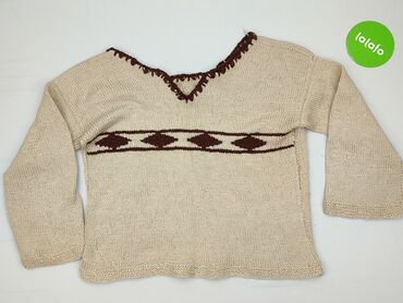Sweter damski w kolorze beżowym, wykonany z dzianiny o luźnym splocie, co sprawia, że jest przewiewny i komfortowy. Charakteryzuje się dekoltem w kształcie litery V z ozdobnym, ażurowym wzorem. Dłu...