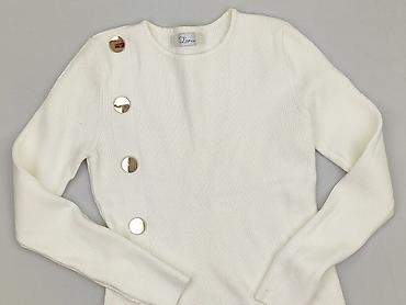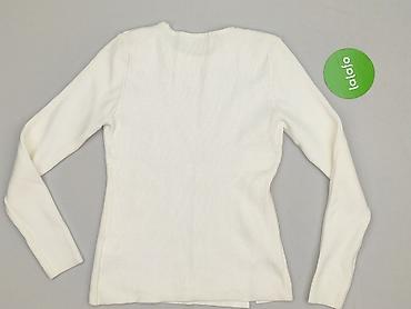 Sweter damski, dzianinowy, biały/kości słoniowej. - Fason: luźny, prosty, lekko wydłużony tył - Dekolt: w kształcie litery V z dekoracyjnym splotem na środku - Rękawy: 3/4 z szerokimi ściągaczami -...