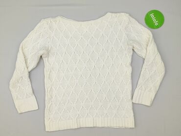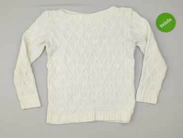Ażurowy sweter damski w kolorze ecru/śmietankowym. - Krój: sweter z okrągłym dekoltem, lekko bufiastymi rękawami i długim mankietem. - Splot: dekoracyjne, poziome pasy ażurowych wzorów; gęstszy śc...Stan: