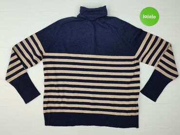 Ten damski sweter z golfem charakteryzuje się wzorem w paski w odcieniach granatu i beżu. Model z długim rękawem zapewnia ciepło i komfort. Idealnie sprawdzi się w chłodniejsze dni, dodając stylu każdej stylizacji.