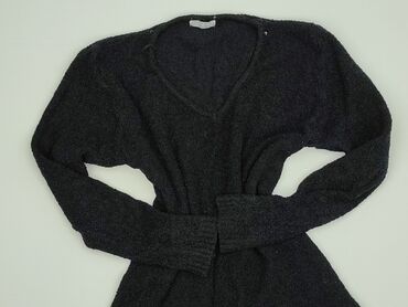 Sweter damski prążkowany, czarny - Fason: dopasowany, z dłuższą linią tułowia - Dekolt: V-neck - Rękaw: długi, zakończony mankietem - Dzianina: elastyczna, miękka, prążkowana (widoczne pionowe żeb...
