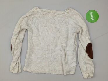 Kremowy sweter damski z okrągłym dekoltem, charakteryzujący się splotem w warkocze na przodzie. Długie rękawy i dół swetra wykończone są ściągaczem. Sweter jest wykonany z dzianiny o widocznej fakt...Stan: