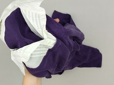 OkrągłyFioletowy sweter damski z długimi rękawami i okrągłym dekoltem. Sweter ma wszytą białą koszulę z kołnierzykiem i pionowymi paskami, dodającą stylizacji warstwowości. Koszula wystaje spod dekoltu swetra, tworząc efekt dwuwarstwowego ubrania. Jest to idealny wybór do codziennych stylizacji, zapewniający komfort i modny wygląd. Doskonale sprawdzi się w chłodniejsze dni.