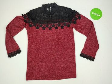 OkrągłyCzerwony sweter damski z długim rękawem i czarnymi koronkowymi wstawkami. Dekolt typu stójka i mankiety wykończone są czarną koronką z motywem kwiatowym, co nadaje mu elegancki wygląd. Idealny na chłodniejsze dni, sprawdzi się zarówno w codziennych stylizacjach, jak i na bardziej formalne okazje.
