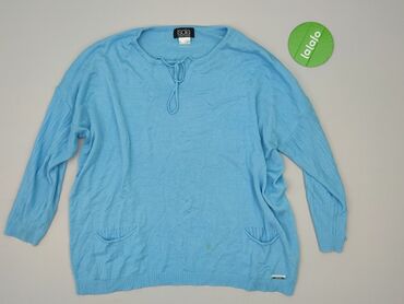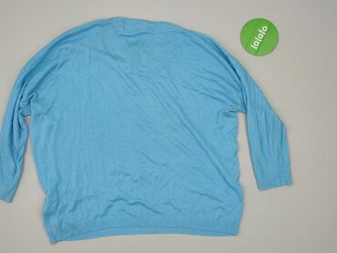 Sweter damski, dzianinowy, w kolorze denimowego niebieskiego. - Fason: luźny, oversize z obniżoną linią ramion - Dekolt: okrągły, prążkowany - Rękaw: długi - Dzianina: przewiewny, ażurowy splot o ...
