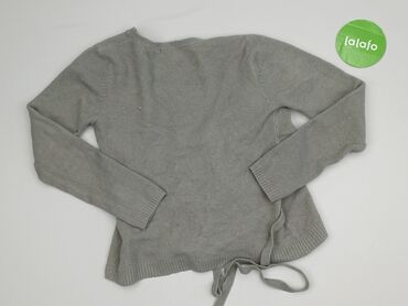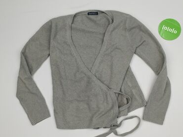 Kardigan damski Ksdulon, rozmiar M/L. - Kolor: grafitowy melanż - Krój: zapinany na guziki, dekolt w serek - Detale: ozdobne marszczenia/falbanki z przodu, szeroki ściągacz w pasie i przy mankieta...