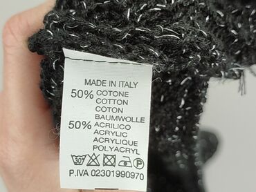 Sweter damski z włoskiej produkcji, czarny z subtelną, złotawą nitką (melanż z połyskiem). - Fason: luźny, z obniżoną linią ramion i szerokimi rękawami zwężanymi przy mankietach; dół wykończony śc...Stan: