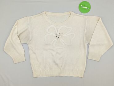 OkrągłySweter damski w kolorze ecru/kremowym, dzianina o średnim splocie. Model z okrągłym dekoltem, długimi rękawami i szerokimi ściągaczami przy mankietach oraz u dołu. Na przodzie duży, wypukły haft w kształcie kwiatu, uzupełniony drobnymi czarnymi aplikacjami/koralikami w centrum. Tył gładki.