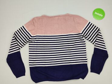 Damski sweter w paski, rozmiar M - Krój: klasyczny, z okrągłym dekoltem i długim rękawem - Wzór: poziome pasy w odcieniach jasnoniebieskiego, brązu, czerni i szarości na kremowym tle - Materiał: 1...
