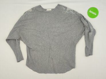 Srebrny sweter damski z połyskiem - Krój: luźny, swobodny, lekko oversize - Dekolt: okrągły - Rękaw: 3/4 z delikatnym ściągaczem - Dół: wykończony ściągaczem, lekko asymetryczny - Rozmiar z metki:...