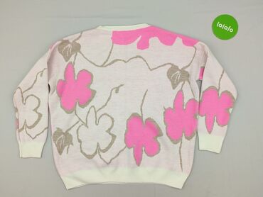 Damski sweter dzianinowy z pastelowym, akwarelowym nadrukiem kwiatowym. - Kolor bazowy: złamana biel/ecru - Wzór: wielokolorowe kwiaty i liście w odcieniach zieleni, różu, błękitu i fioletu - Krój...