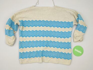 Damski sweter z miękkiej, „włochatej” przędzy, w paski. - Kolor: biały z jasnoniebieskimi pasami - Krój: klasyczny, z okrągłym dekoltem - Rękawy: długie, w tym samym, puszystym splocie - Wzór: poz...