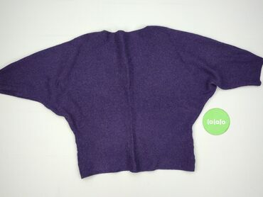 Fioletowy sweter damski z połyskującą nitką - Krój: luźny, nietoperzowe rękawy 3/4 z szerokimi, prążkowanymi mankietami; dół również delikatnie ściągany - Dzianina: ażurowa, miękka przędza z metal...