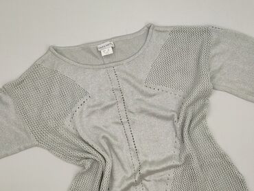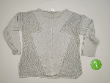 Szary sweter damski z ażurowymi wstawkami i perełkami - Fason: luźny, lekko wydłużony tył, delikatnie rozkloszowany dół - Rękaw: 3/4 - Dekolt: okrągły z ażurową lamówką - Detale: po bokach pionowe...Stan: