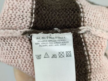 Sweter damski w pasy, różowo-biały - Krój: klasyczny, proste rękawy, okrągły dekolt - Wzór: szerokie, ukośne pasy układające się w kształt litery V z przodu i z tyłu; pasy na rękawach - Kolor: pud...Stan: