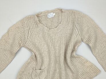 Sweter damski dzianinowy w kolorze jasnego beżu/ecru. - Krój: klasyczny, z okrągłym dekoltem i długim rękawem - Wzór/wykończenie: gładki splot u góry, ażurowe wstawki na dole i na mankietach (ozdo...