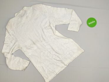 Sweter damski, dzianinowy, w kolorze ecru/kremowym. - Fason: wydłużony (tuniko-sweterek), prosty - Dekolt: łódka/lekko zaokrąglony - Rękaw: 3/4 - Dzianina: ażurowa, wyraźny, falowany splot; miękki...