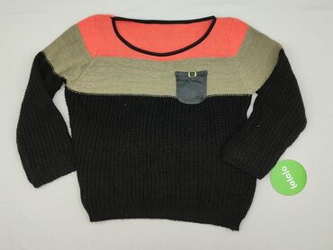- Model: dzianinowy sweter z kontrastowymi pasami kolorystycznymi