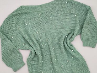Jasny sweter damski z okrągłym dekoltem, ozdobiony licznymi, równomiernie rozmieszczonymi perełkami w dwóch rozmiarach i kolorach: białym i srebrnym. Raglanowe rękawy dodają sweterowi swobodnego ch...