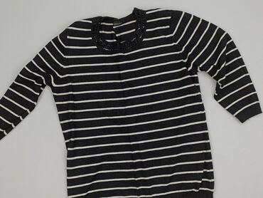 Czarny sweter damski w pasy, luźny krój nietoperz (batwing) - Kolor: czarny z beżowo‑złotymi, szerokimi pasami na całej szerokości oraz na rękawach - Dzianina ażurowa, przewiewna; pasy wykonane z p...