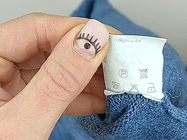- Metki pielęgnacyjne: pranie w 30°C, nie wybielać, prasowanie na niskiej temp., czyszczenie chemiczne dozwolone, nie suszyć w suszarce