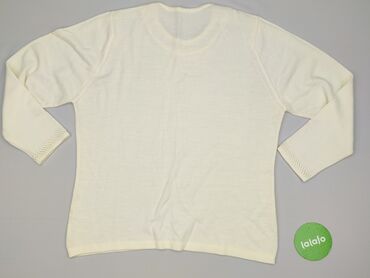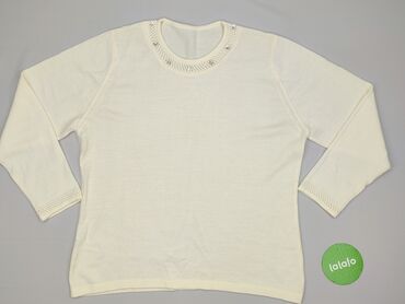 Damski sweter dzianinowy w kolorze ecru/śmietankowym. - Fason: klasyczny, z okrągłym dekoltem i długim rękawem. - Splot: ażurowe pasy oraz wypukłe „bąbelki” na przodzie i rękawach, drobne ażury w...