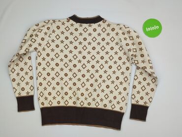 Sweter damski z dzianiny, beżowy z brązowymi detalami. - Krój: luźny, prosta linia, długie rękawy - Dekolt: w kształcie litery V, wykończony ozdobną brązową koronką/szydełkowym obszyciem - Wzór: p...