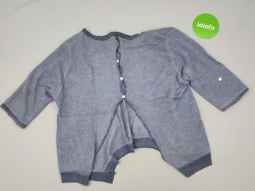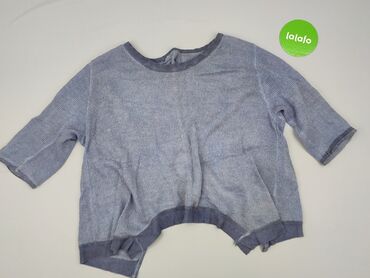 Sweter damski z dzianiny, w kolorze jasnego melanżowego błękitu/szarości. Luźny, pudełkowy krój z asymetrycznym, zaokrąglonym dołem i rękawami 3/4. Okrągły dekolt wykończony ściągaczem. Z tyłu listwa z małymi guzikami (możliwość noszenia jako kardigan tyłem do przodu). Ażurowa, lekko prześwitująca faktura – miękka, lekka dzianina idealna na warstwowe stylizacje.