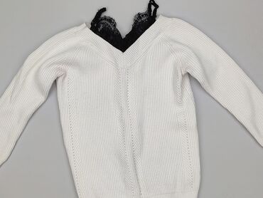 Biały sweter damski z krótkim rękawem - Krój: klasyczny, z dekoltem w kształcie litery V - Długość rękawa: krótki - Struktura dzianiny: wyraźny, drobny splot; ściągacz na dole i przy rękawach - Sk...