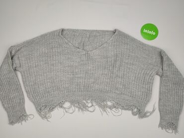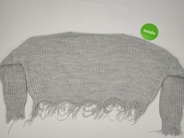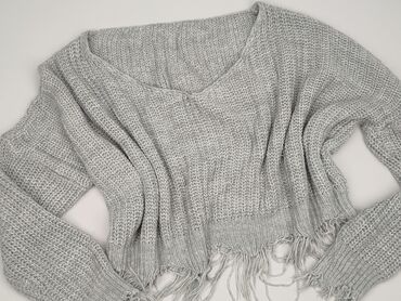 W serekSzary sweter damski, krótki (crop), o grubym, wyraźnym splocie. Dekolt w kształcie litery V. Długie rękawy. Dół i mankiety wykończone postrzępionymi, dekoracyjnymi frędzlami w stylu distressed.
