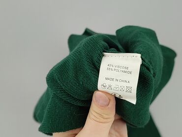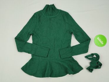Zielony sweter damski z połyskiem, rozmiar S - Fason: klasyczny, z długim rękawem i półgolfem; ściągacze przy kołnierzu, mankietach i na dole. - Kolor/wykończenie: ciemna zieleń z delikatną, metal...