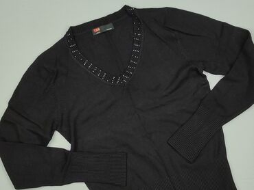 W serekCzarny sweter damski T&M Fashion, rozmiar M. Klasyczny fason z dekoltem w serek ozdobionym drobnymi aplikacjami/błyszczącymi dżetami. Długie rękawy. Szerokie, prążkowane ściągacze przy mankietach i na dole swetra, dzięki czemu ładnie trzyma fason.