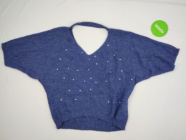 Sweter damski z dekoltem V, granatowy, z ozdobnymi perełkami i dżetami na ramionach. - Fason: dopasowany, długość do bioder - Rękaw: długi, szerokie ściągacze przy mankietach i u dołu - Kolor: cie...