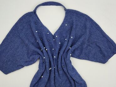 Niebieski sweter/ponczo damskie z krótkim rękawem - Fason: luźny, prosty, przypominający ponczo; raglanowe linie ramion; krótki rękaw typu kimono - Dekolt: półokrągły - Długość: do bioder - Dziani...