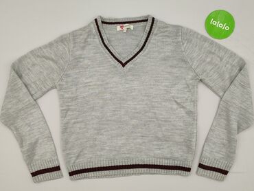 Sweter damski w pasy, rozmiar M - Krój: klasyczny, z okrągłym dekoltem - Wzór i kolory: poziome pasy w odcieniach szarości, kremu i brązu; drobne ażurowe prześwity między pasami - Materiał: 100% p...