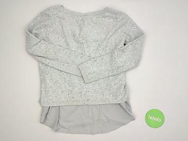 Srebrny sweter damski z połyskiem - Krój: luźny, swobodny, lekko oversize - Dekolt: okrągły - Rękaw: 3/4 z delikatnym ściągaczem - Dół: wykończony ściągaczem, lekko asymetryczny - Rozmiar z metki:...