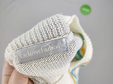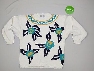 Sweter damski, rozmiar 40, w kolorze kremowym/waniliowym. - Fason: luźniejszy, z szerokim kołnierzem typu szalowego; dekolt w kształcie V. - Splot: wyrazista, “wafelkowa” dzianina; dekoracyjny ...