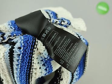 - Wzór/kolor: poziome pasy w odcieniach bieli, czerni, niebieskiego i błękitu; ażurowa, strukturalna dzianina dodająca lekkości.