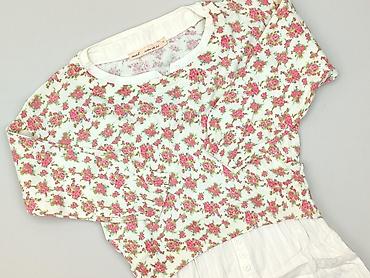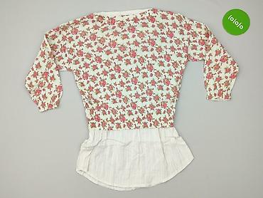 - Fason: warstwowy “2 w 1” – górą elastyczny sweter w drobne kwiaty, dołem doszyta biała koszulowa wstawka z listwą guzikową i zaokrąglonym dołem
