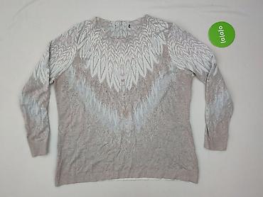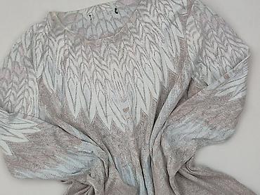 Sweter damski z długim rękawem, cienka dzianina z dekoracyjnym, symetrycznym wzorem przypominającym pióra/liście w odcieniach beżu, bieli i jasnego różu oraz błękitu.