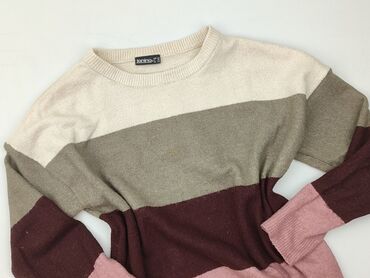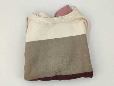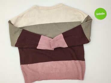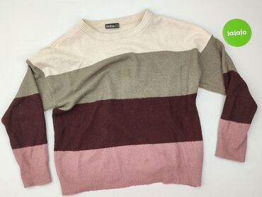 - Wzór: szerokie, poziome pasy w odcieniach kremu, taupe/oliwki, bordo i pudrowego różu; mankiety i dół zakończone ściągaczem.
