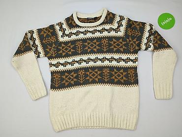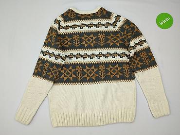 Sweter damski w pasy, rozmiar M - Krój: klasyczny, z okrągłym dekoltem - Wzór i kolory: poziome pasy w odcieniach szarości, kremu i brązu; drobne ażurowe prześwity między pasami - Materiał: 100% p...