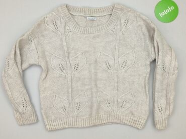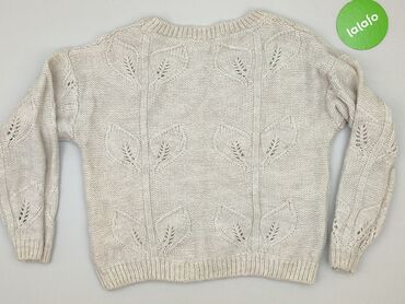 Sweter damski dzianinowy w kolorze jasnego beżu/ecru. - Krój: klasyczny, z okrągłym dekoltem i długim rękawem - Wzór/wykończenie: gładki splot u góry, ażurowe wstawki na dole i na mankietach (ozdo...