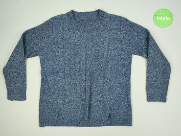 Sweter damski, dzianinowy, w kolorze denimowego niebieskiego. - Fason: luźny, oversize z obniżoną linią ramion - Dekolt: okrągły, prążkowany - Rękaw: długi - Dzianina: przewiewny, ażurowy splot o ...Stan: