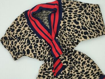 Sweter damski z długim rękawem, wzór cętkowany z przejściem w kropki. - Kolorystyka: beż z czarnymi i karmelowymi akcentami. - Dekolt: w serek (V-neck). - Krój: dopasowany, elastyczne ściągacze prz...