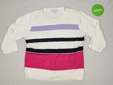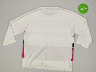 Sweter damski w pasy, rozmiar M - Krój: klasyczny, z okrągłym dekoltem - Wzór i kolory: poziome pasy w odcieniach szarości, kremu i brązu; drobne ażurowe prześwity między pasami - Materiał: 100% p...