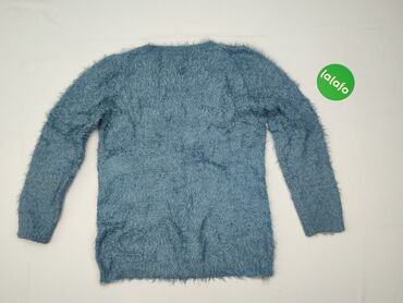 Damski sweter z miękkiej, „włochatej” przędzy, w paski. - Kolor: biały z jasnoniebieskimi pasami - Krój: klasyczny, z okrągłym dekoltem - Rękawy: długie, w tym samym, puszystym splocie - Wzór: poz...
